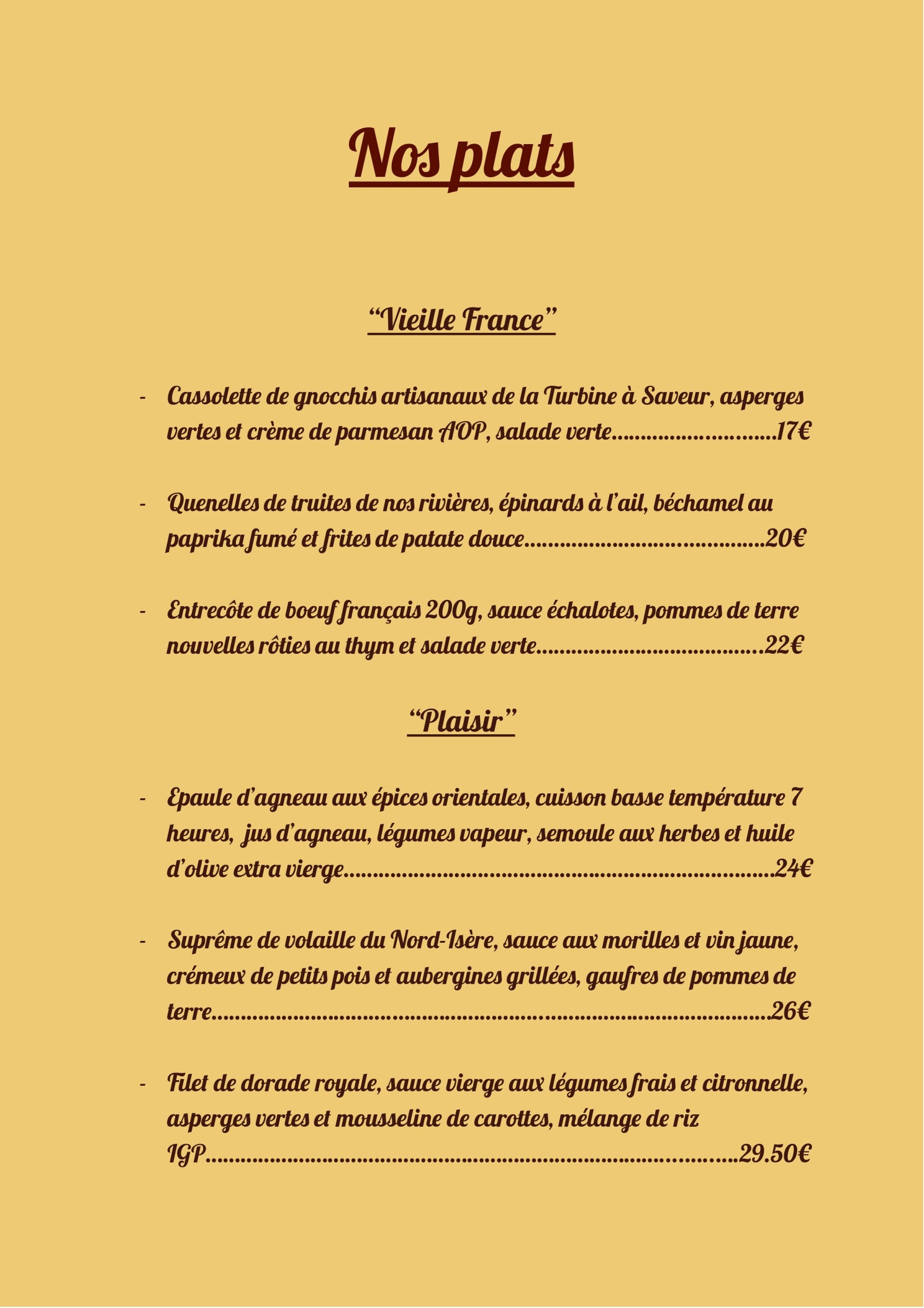 Découvrez notre carte, conçu avec amour et passion. Chez Ô P'tit Four, nous mettons en avant la cuisine locale et des saveurs authentiques. Laissez-vous tenter par nos plats exceptionnels et rejoignez-nous pour un voyage à travers nos plats "vieille France" ou "Gastronomiques" à Creys-Mépieu.